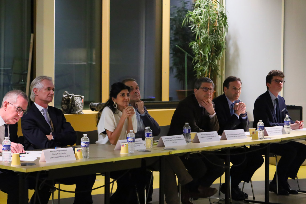 À cette occasion, sont intervenus M. Jacques BOULARD (premier président de la cour d’appel de Paris), M. Antoine GARAPON (magistrat et sociologue), Me Antoine GOSSET-GRAINVILLE (président d’AXA et avocat à la Cour), Me Negar HAERI (ancienne secrétaire de la Conférence et avocat à la Cour) ainsi que Me Pierre HOFFMANN (bâtonnier sortant de l’Ordre des avocats).