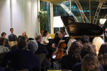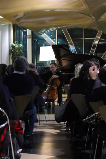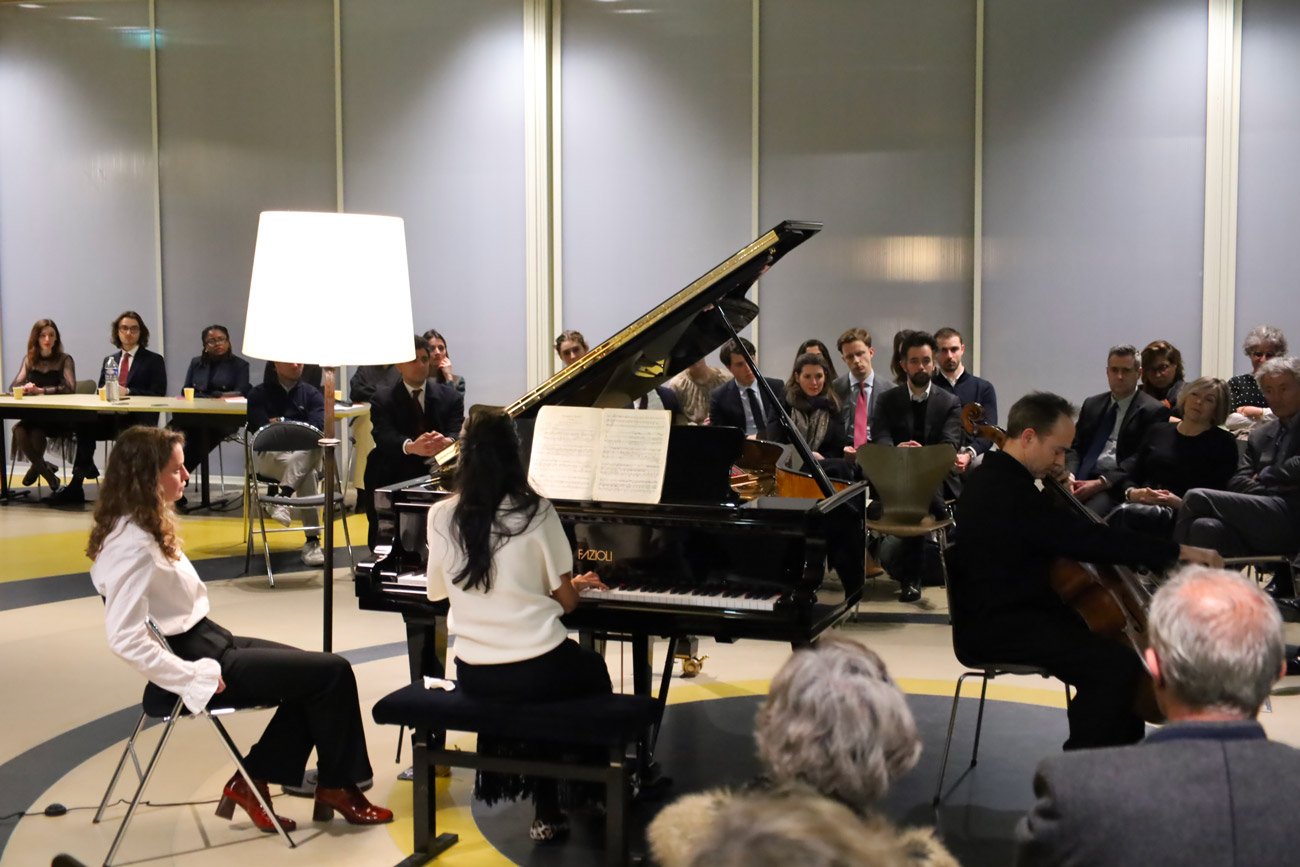 Après avoir achevé les discussions sur le thème de la parole, les invités ont laissé place à l’une de ses formes animée et vivante : la musique. Ce moment a été offert par l’avocate et pianiste Me Negar HAERI et le violoncelliste Henri DEMARQUETTE qui ont interprété l’Arpeggione Sonate de Franz Schubert et la Suite no 3 de Jean-Sébastien BACH.